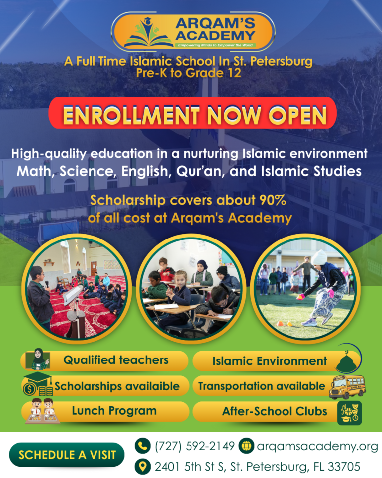 Arqam’s Academy offers faith-centered learning for Pre-K to 12th grade. We blend strong academics with Quran memorization, Arabic, and Islamic studies in a safe, caring community. Our goal is to grow each student’s mind, character, and spirituality. Join us for the 2025–2026 school year and partner with us to help your child thrive.